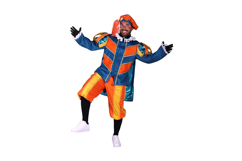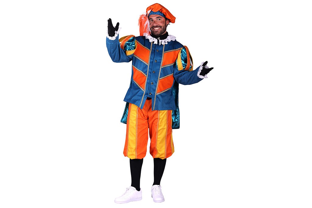 Luxe pietenkostuum met mooie pofmouwen en cape, dit kostuum bestaan uit een comfortabel 2-delig kostuum met elastiek in de band uitgevoerd in vrolijke kleuren, sierlijk afgewerkt met bijpassende pet. Dit kostuum is geschikt om te dragen voor dames en heren.