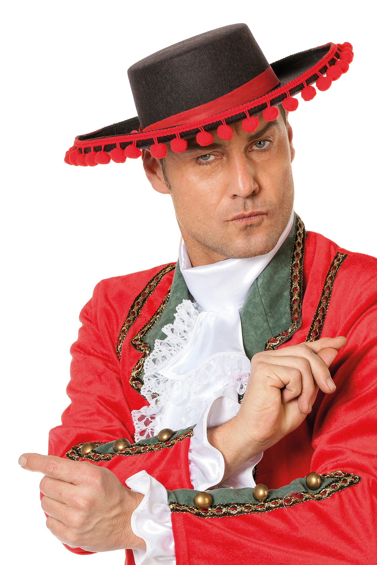 Zwarte spaanse hoed met rode bollen. Ga voor een traditionele outfit van Spanje.