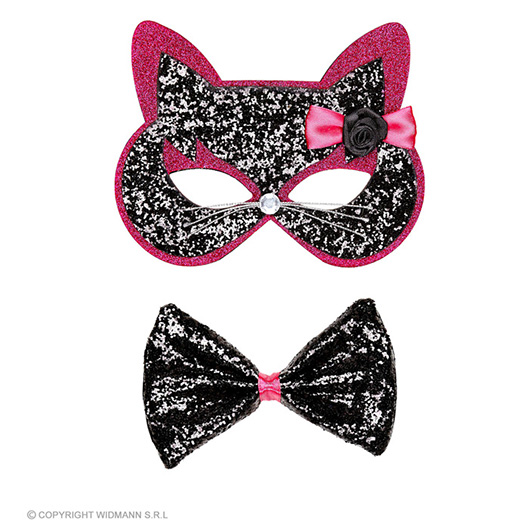 Oogmasker kat met strikje zwart/rose. Kattenmasker.