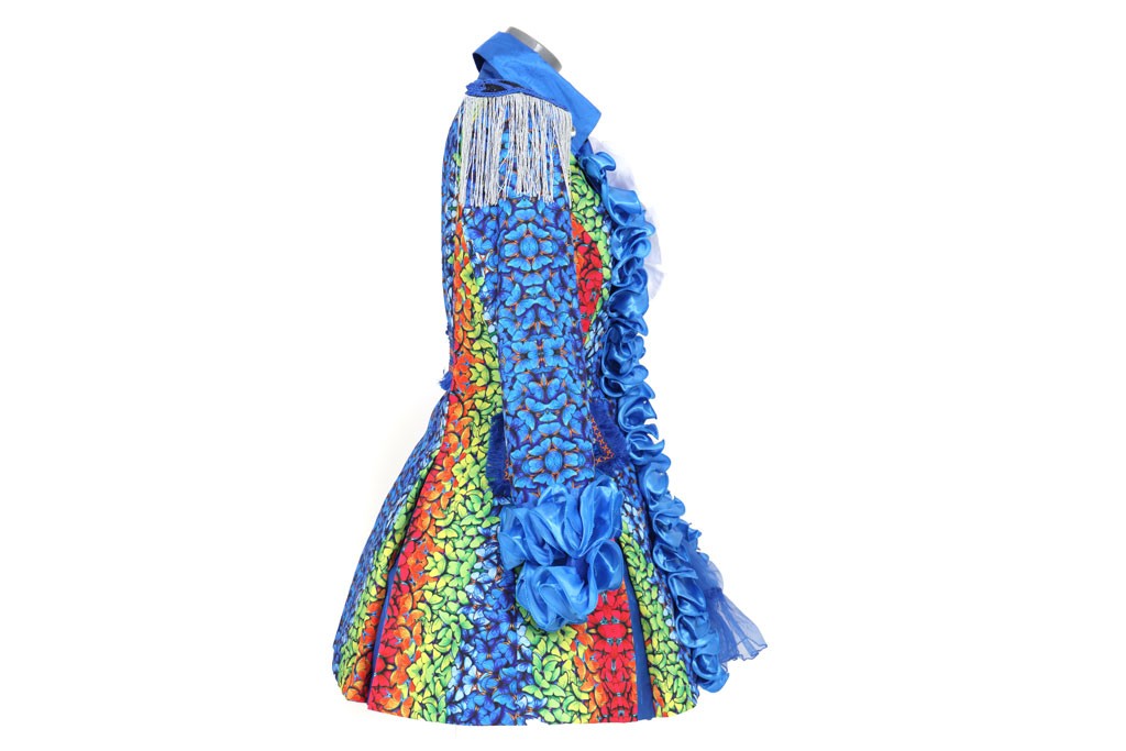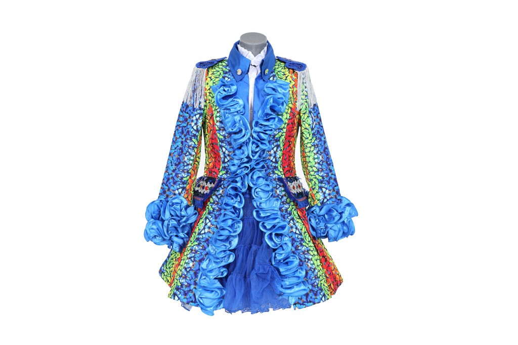 Wat een luxe carnavalsjas! prachtig afgewerkt in vrolijke kleuren met vlinderprint. Mooie Ruches aan de mouwen en langs de sluiting.