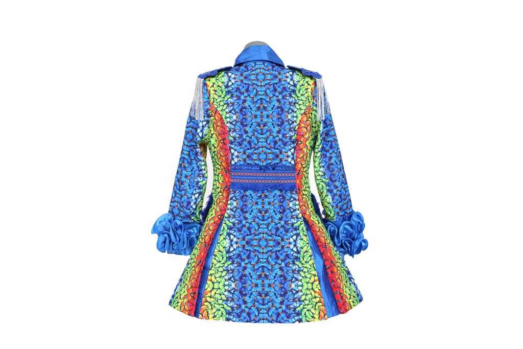 Deze feestelijke jas combineert luxe en plezier met een prachtige vlinderprint die zorgt voor een vrolijke uitstraling.