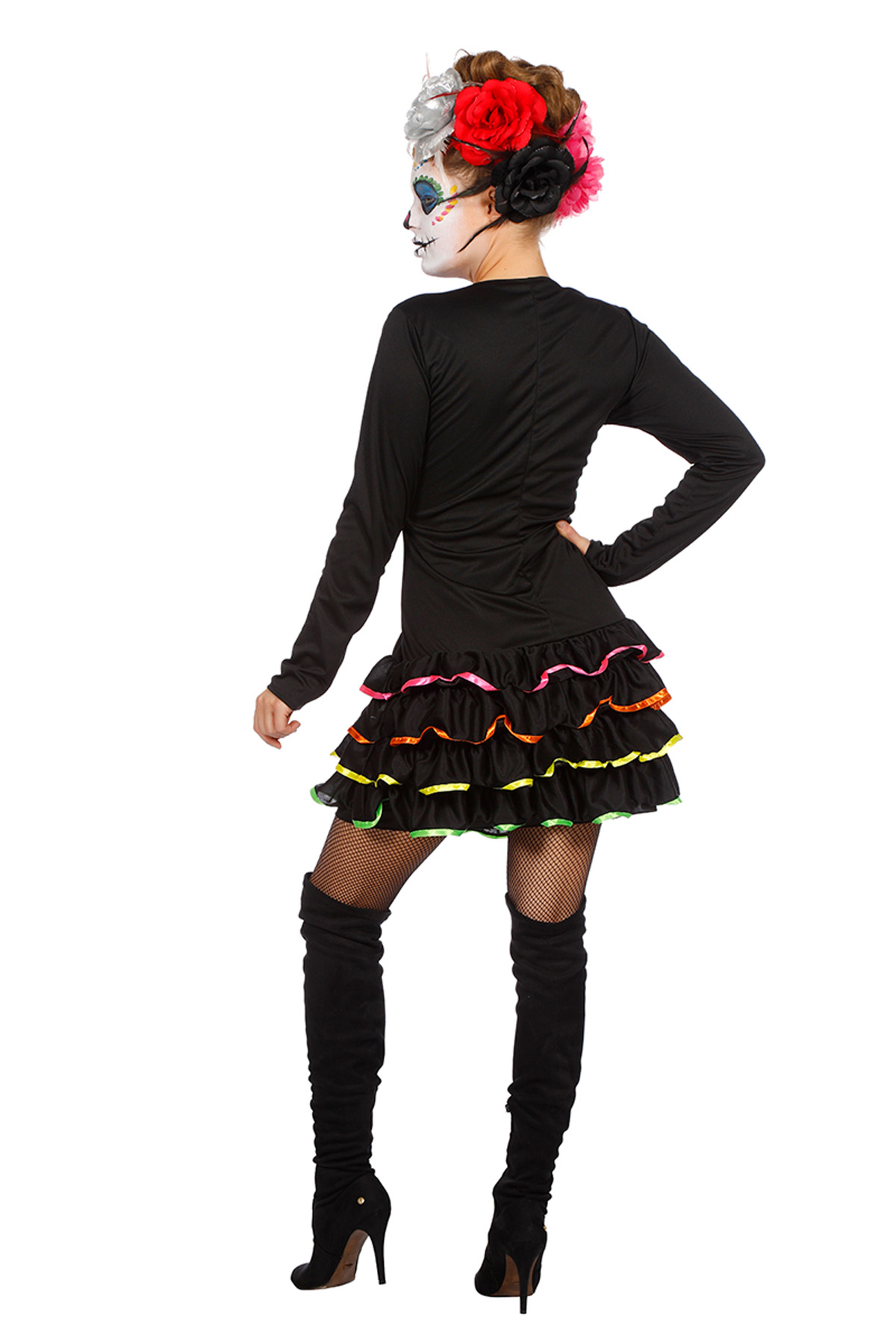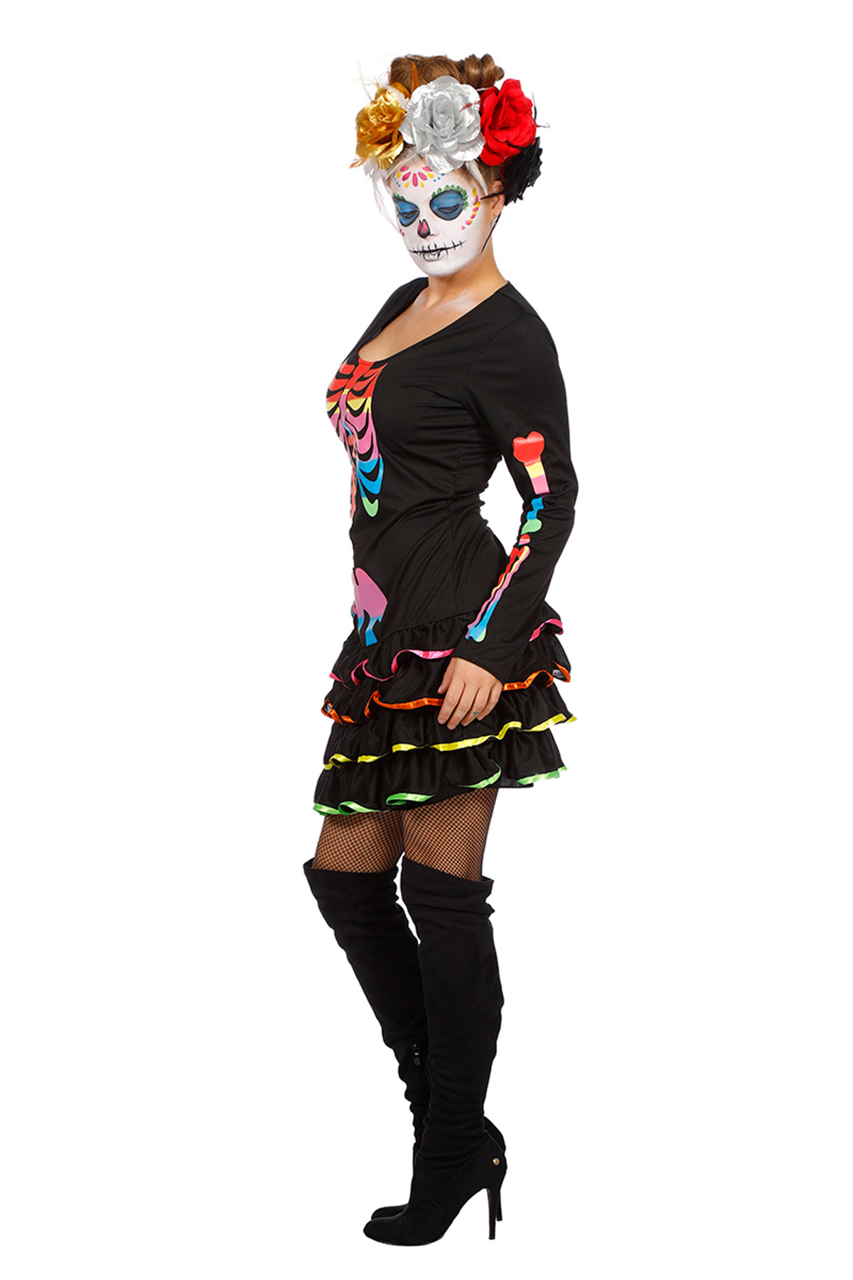 Zwart jurkje met neon skelet print, met lange mouwen.