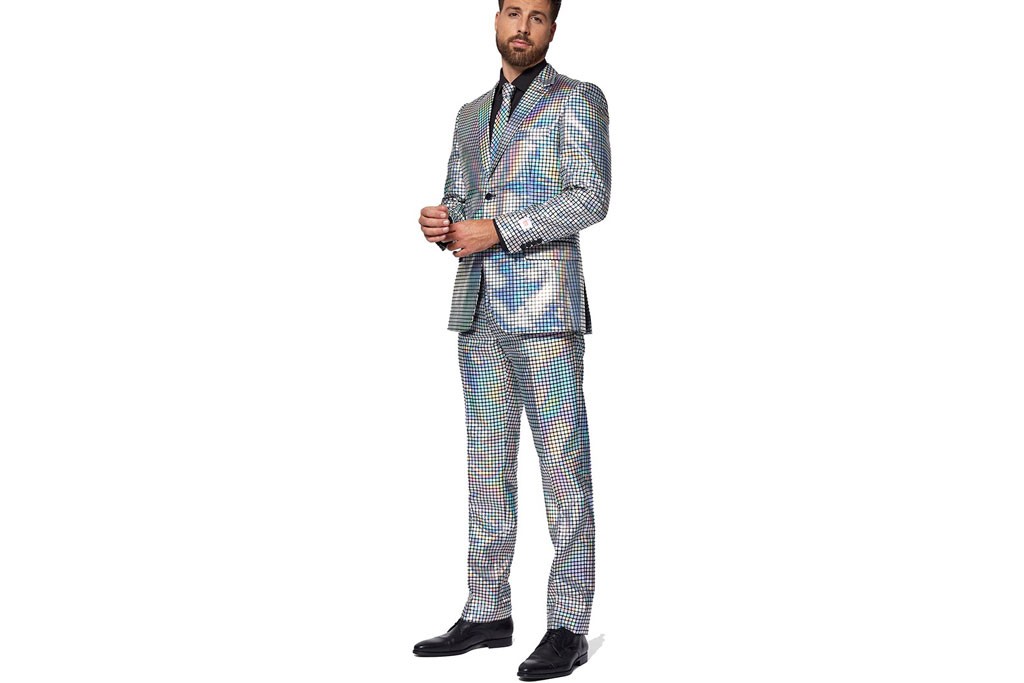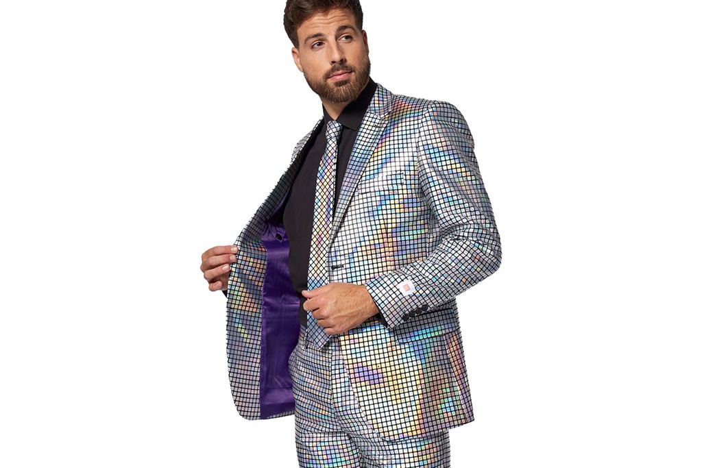 Opposuits Discoballer official. Pak bestaande uit broek, jas en stropdas.