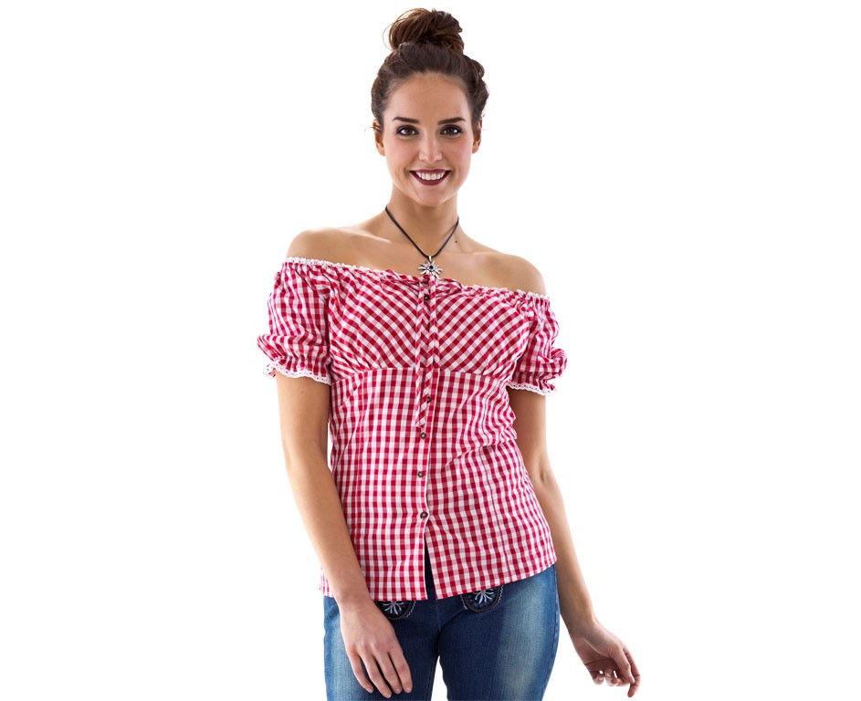 Oktoberfest blouse Carmen rood wit geblokt uit de collectie van Haus Huberts