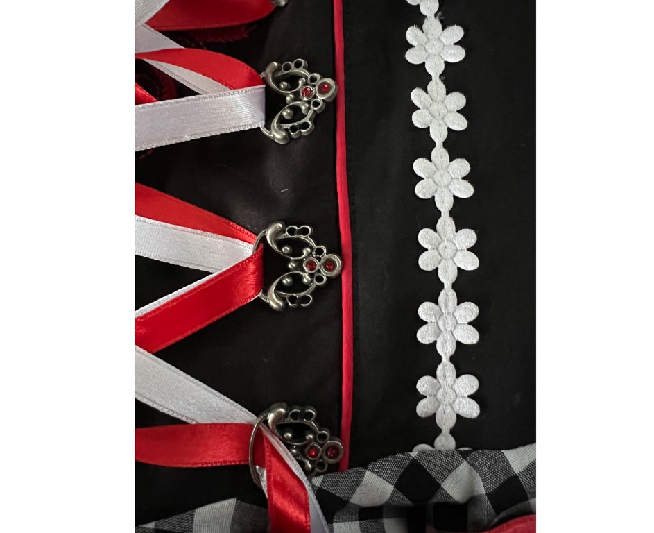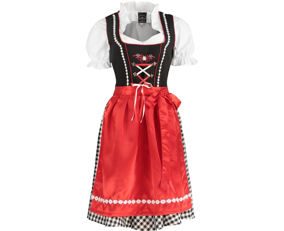 Dirndl tirolerjurkje zwart met geblokte rok. 3-delig incl. jurkje, blouse en rode satijnen schort. (Haus Hubets collectie).