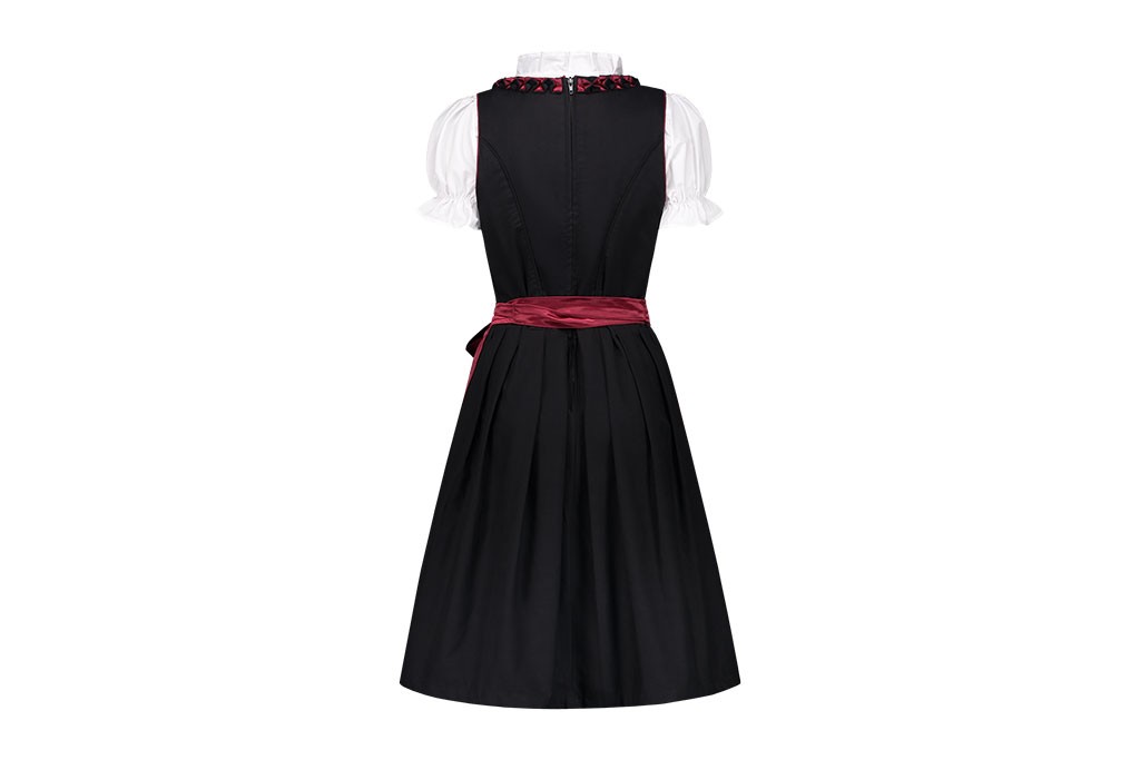 Tirolerjurk met verstelbaar decolleté en wijnrode satijnen schort met sierbiezen en kant.