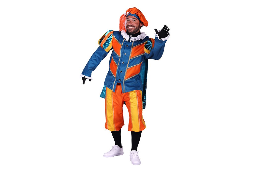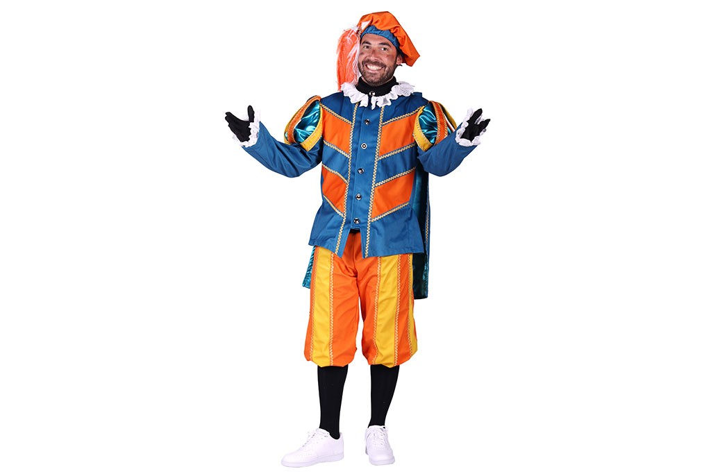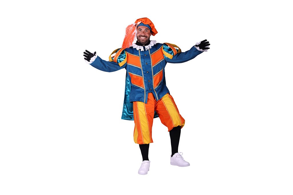 Luxe pietenkostuum met mooie pofmouwen en cape, dit kostuum bestaan uit een comfortabel 2-delig kostuum met elastiek in de band uitgevoerd in vrolijke kleuren, sierlijk afgewerkt met bijpassende pet. Dit kostuum is geschikt om te dragen voor dames en heren.